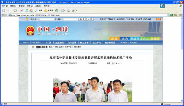 2009年12月1日,由江蘇農(nóng)林職業(yè)技術(shù)學(xué)院和我公司共同承擔(dān)的江蘇省科技掛縣強(qiáng)農(nóng)富民工程子項目――泗洪縣車門鄉(xiāng)車門村水稻千畝機(jī)插秧示范基地建設(shè)項目順利通過考察組驗收。