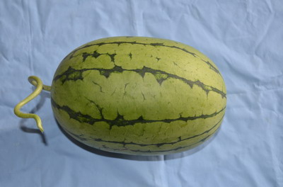 該品種由杭州市良種引進(jìn)公司于2011年從我公司引進(jìn)。 該組合2012年參加浙江省設(shè)施小型西瓜省外引種生產(chǎn)試驗(yàn),平均畝產(chǎn)1407.6公斤,比對(duì)照‘拿比特’增產(chǎn)8.7%。春播從開花到果實(shí)成熟33.0天,第一雌花節(jié)位8.3節(jié),雌花節(jié)位間隔5.9節(jié)。果實(shí)橢圓型,頭茬瓜果形指數(shù)1.2,果皮淺綠色,覆墨綠色狹齒帶,表面光滑,無(wú)棱溝,平均單瓜重2.6公斤。果皮厚0.6厘米左右,瓤色紅色,汁液多,口感好,瓤質(zhì)脆。現(xiàn)場(chǎng)考察實(shí)測(cè)中心折光糖度13.2度,邊緣折光糖度9.2度;耐儲(chǔ)運(yùn)性較好。經(jīng)浙江省農(nóng)科院植微所2012年苗期枯萎病抗性鑒定,平均發(fā)病率為55.0%,病情指數(shù)為47.5,為中抗枯萎病。經(jīng)2012年省品審會(huì)辦公室組織的品質(zhì)品嘗,綜合評(píng)分為90.0分,比對(duì)照高3分,位居第1位。