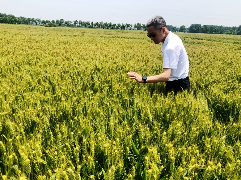 中江種業(yè)總經(jīng)理助理王文在大田里查看揚(yáng)麥45長(zhǎng)勢(shì)情況